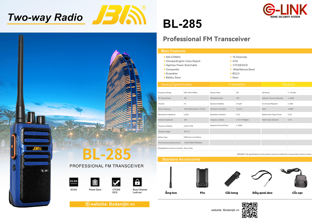 Bộ đàm JBL BL-285 được sản xuất chính hãng và thời gian bảo hành trọn đời thân máy – 12 tháng đổi mới cho Pin sạc.